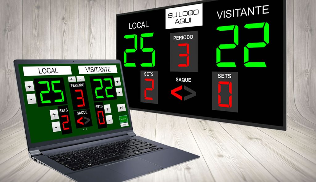 • Visualiza nombre de equipos, tantos, período, sets e indicador de saque.